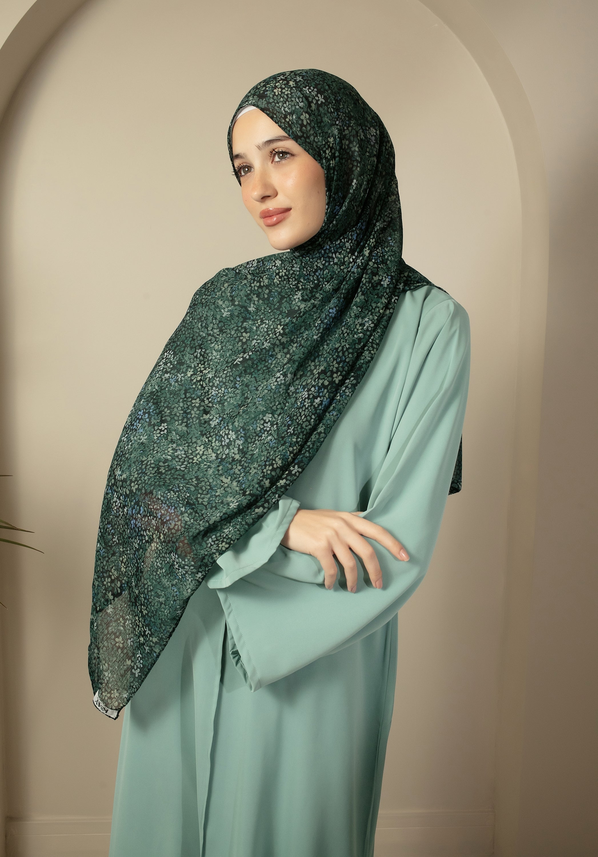 Designed for timeless elegance, this forest green chiffon hijab is crafted from lightweight, breathable fabric that drapes effortlessly. The delicate micro floral print adds a refined touch, creating subtle texture without overpowering your look. Finished with clean edges and a soft matte finish, this hijab is perfect for both elevated everyday wear and special occasions.