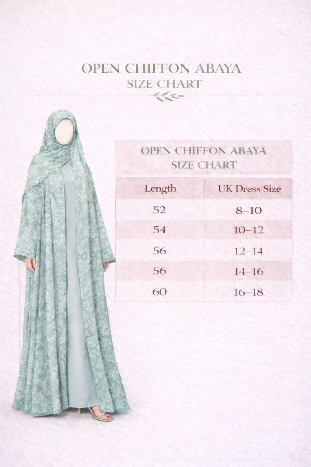 Gracefully designed for effortless elegance, this open chiffon abaya is the perfect balance of modesty and modern sophistication. Crafted in a lightweight, flowing chiffon, the abaya drapes beautifully over the body, creating a soft, airy silhouette that moves with ease.