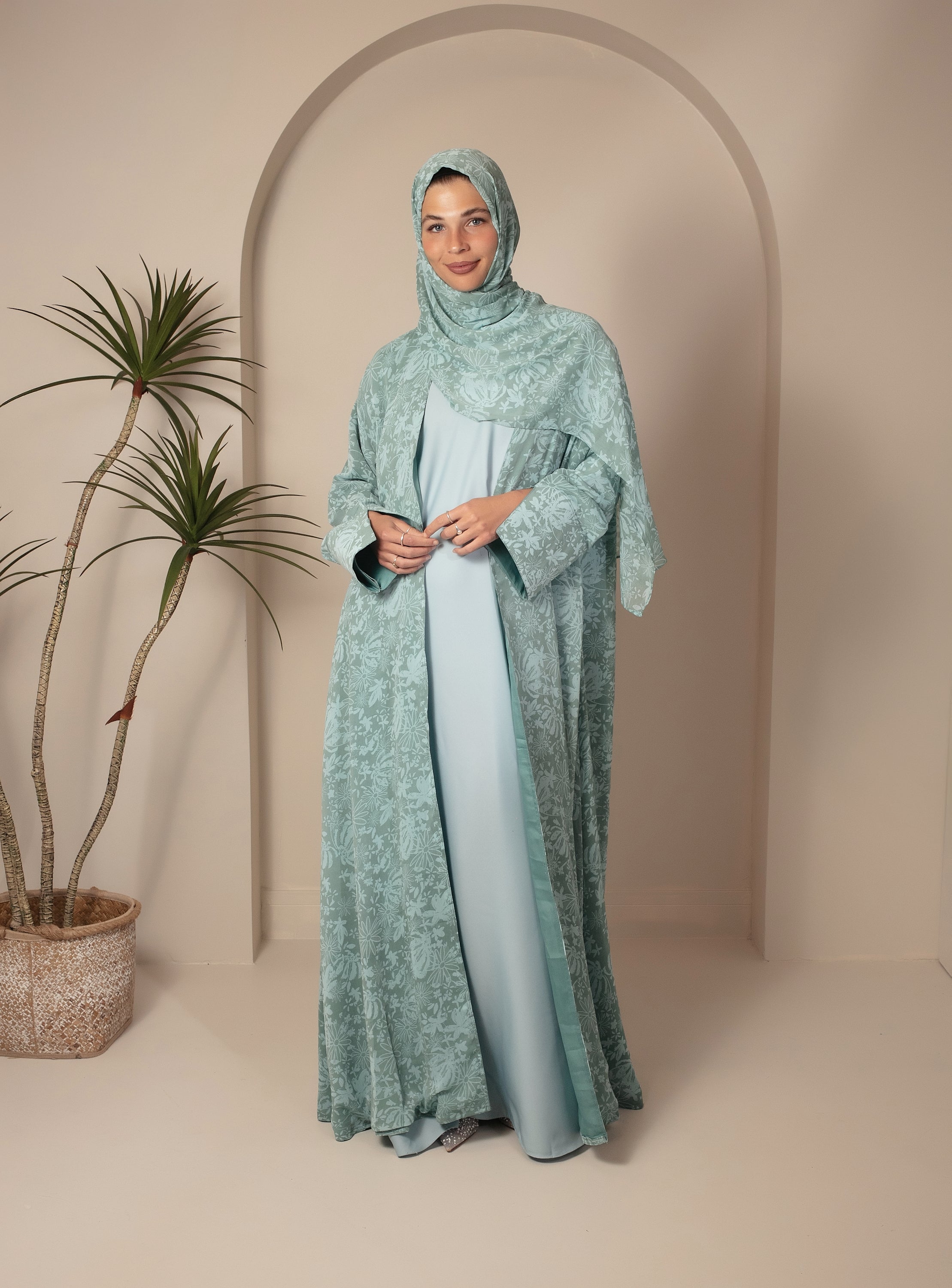 The abaya features a fully coordinated look, complete with a matching inner slip and matching hijab, making it a refined three-piece set ideal for both everyday wear and special occasions.