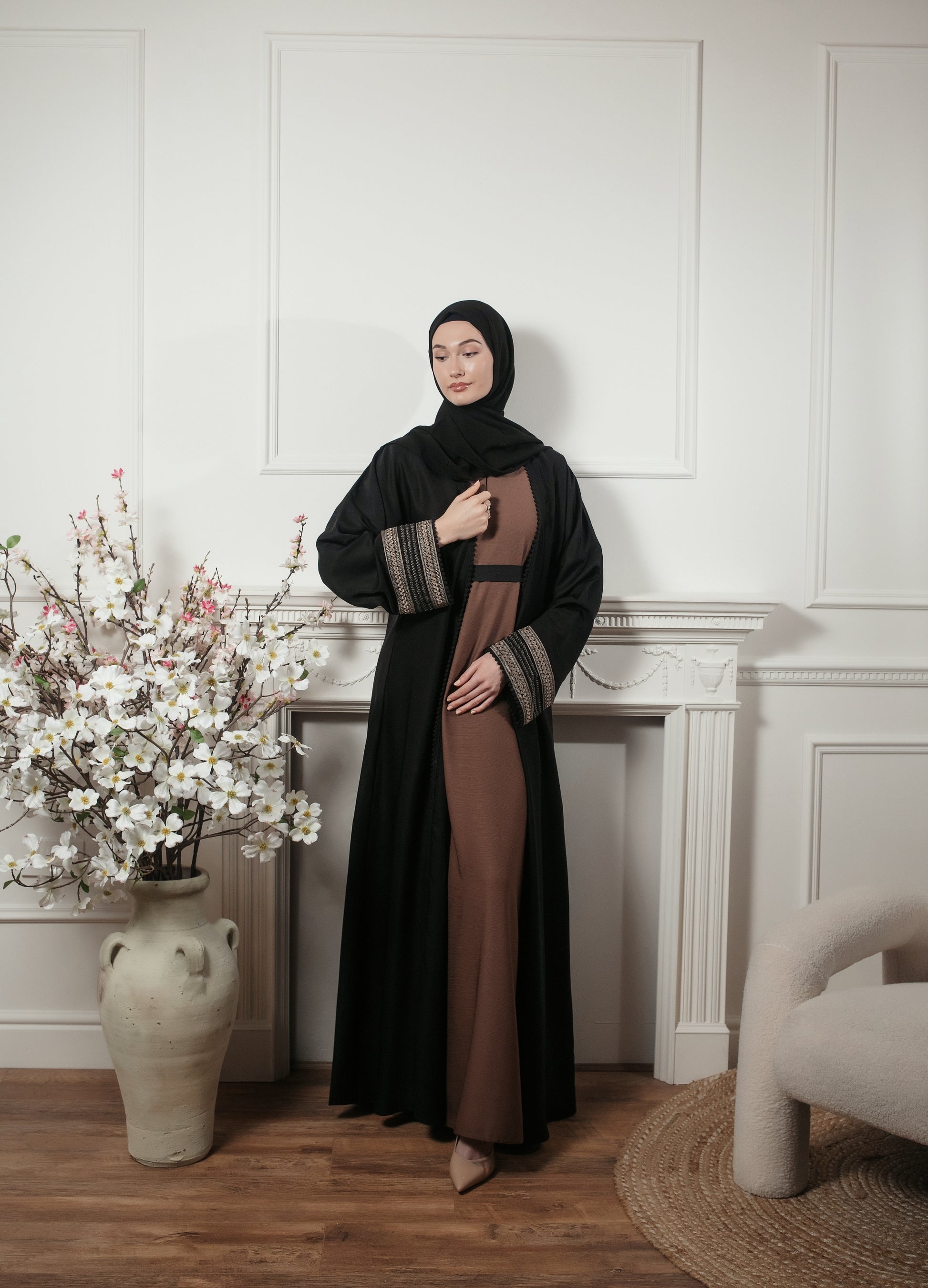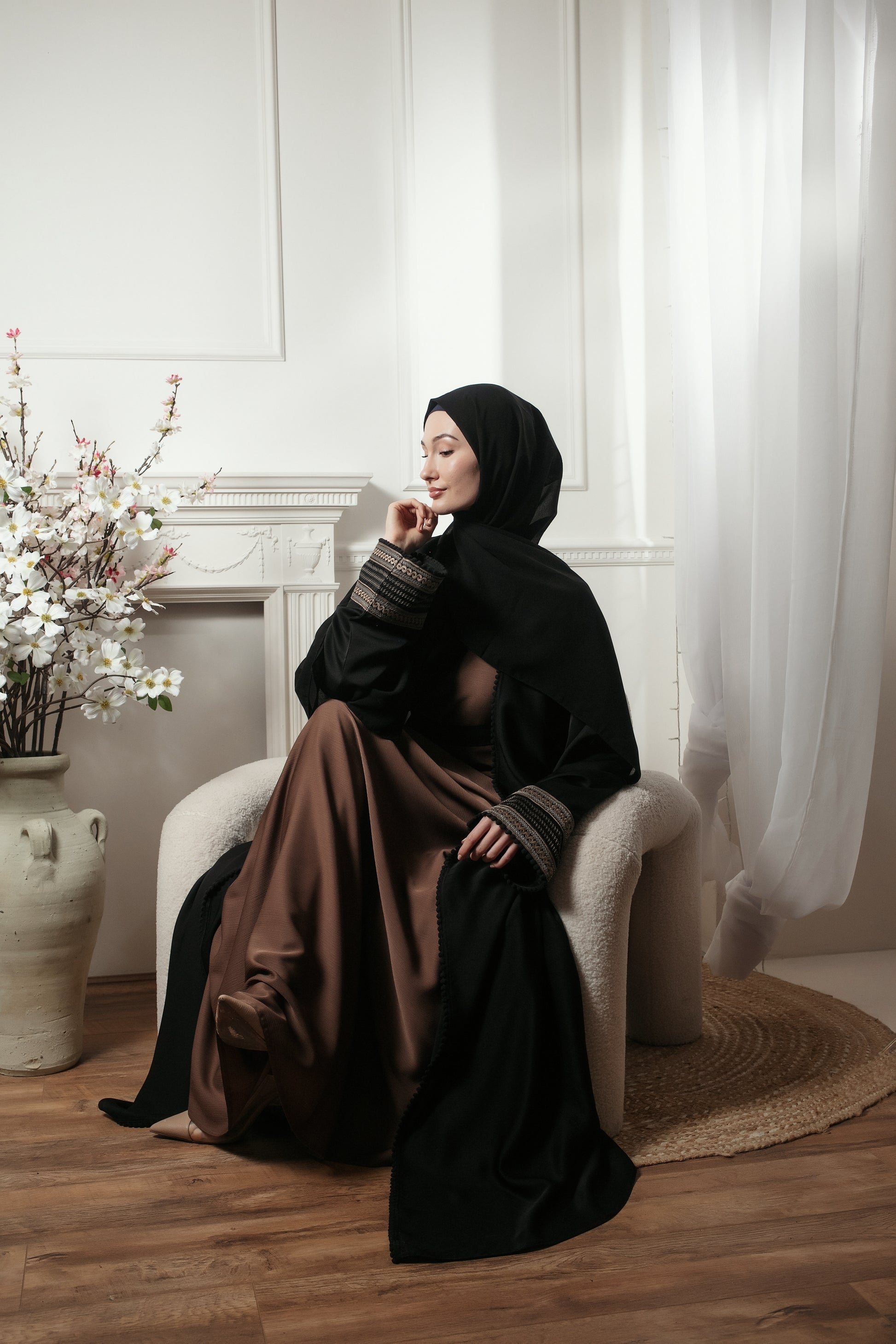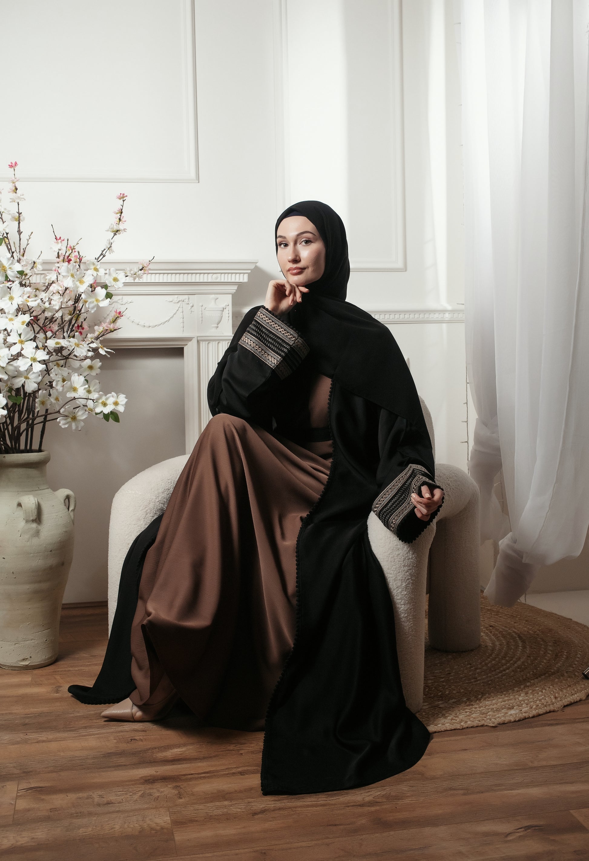 Elevate your modest wardrobe with the Salina Abaya, a timeless piece designed for elegance and comfort. Crafted from high-quality fabric, this flowing black abaya features intricate embroidery on the sleeves for a refined touch. The set includes a perfectly co-ordinated matching slip and hijab, ensuring a complete and effortlessly sophisticated look. Whether for everyday wear or special occasions, the Salina Abaya is a must have for those who appreciate style with grace.