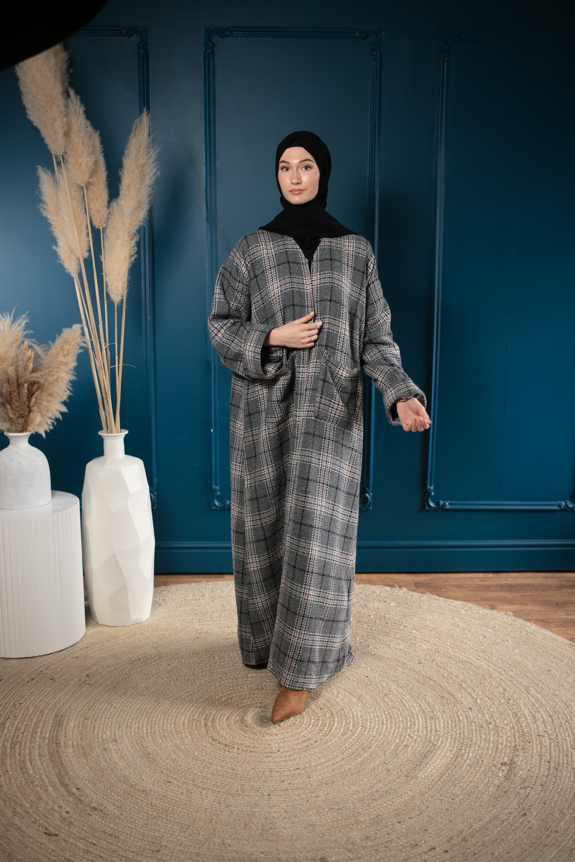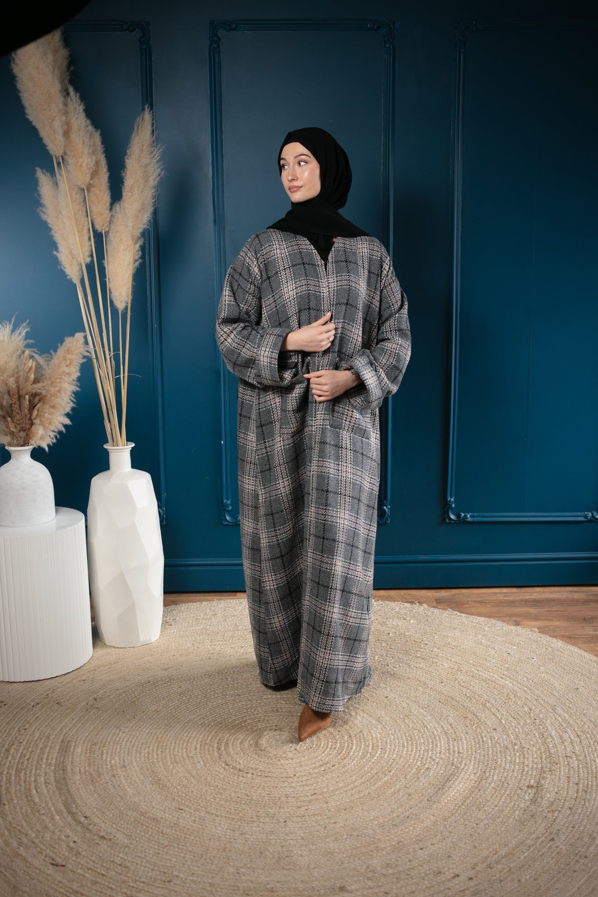 Elevate your winter wardrobe with this chic Abaya coat. Crafted from soft, warm fabric, it features a timeless plaid design and a relaxed fit for effortless elegance. Designed with two deep pockets for practicality.This coat is cozy while staying stylish.